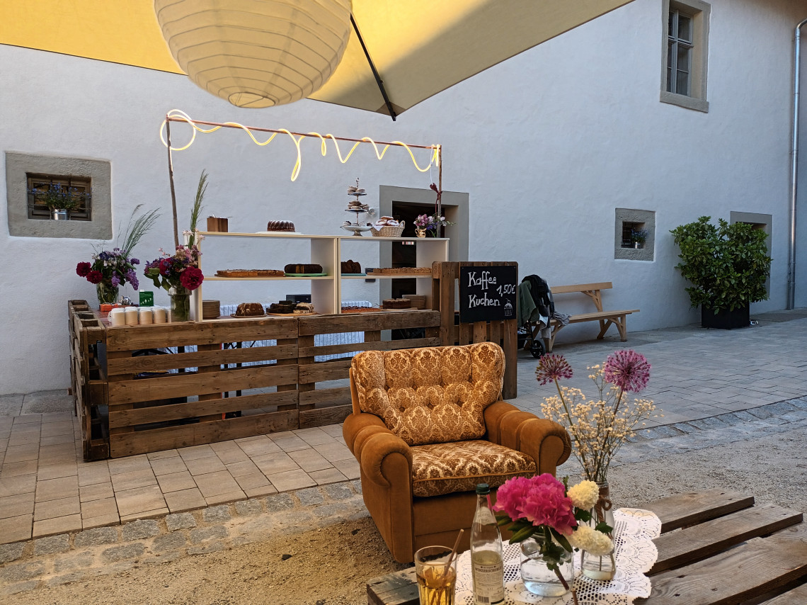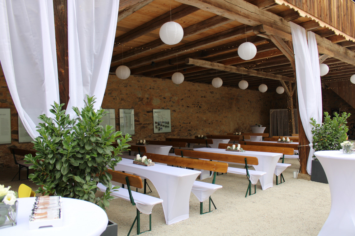 Bei größeren Festen im zum Teil durch die Remise überdachten Innenhof bietet der Gewölbesaal genügend Platz für Buffet oder Getränkeausschank.