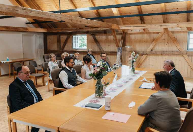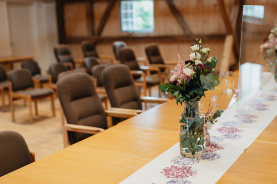 Der offene Scheunencharakter mit sichtbarem Fachwerk verleiht Ihrer standesamtlichen Hochzeit eine festliche Atmosphäre mit einem besonderen Charme.